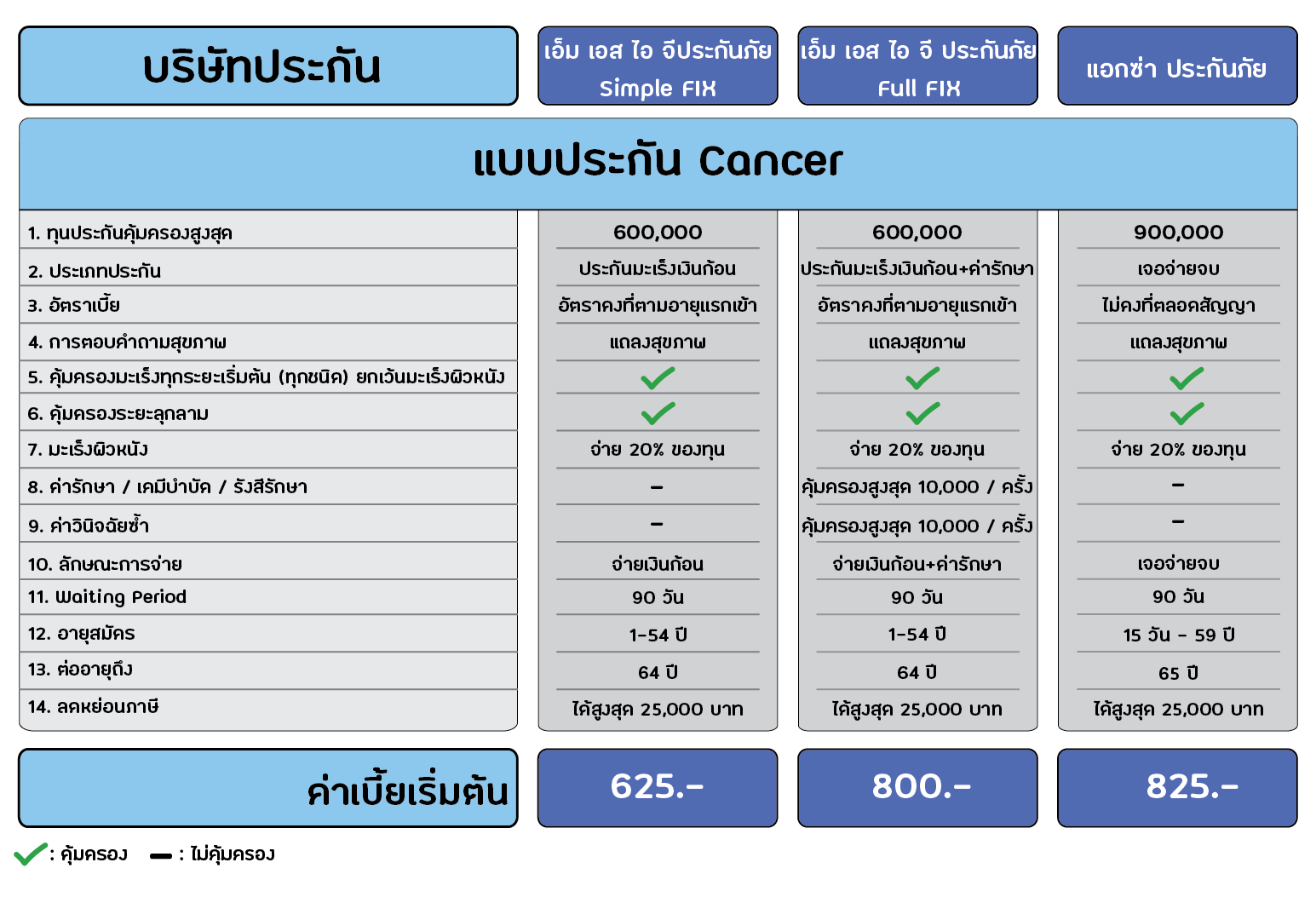 2. เริ่มให้ความคุ้มครอง เมื่อพ้นระยะเวลารอคอย 90 วัน นับแต่กรมธรรม์ประกันภัยมีผลบังคับ และต้องไม่มีอาการหรือการรักษาที่เกี่ยวข้องกับโรคมะเร็งมาก่อนการทำประกันภัย