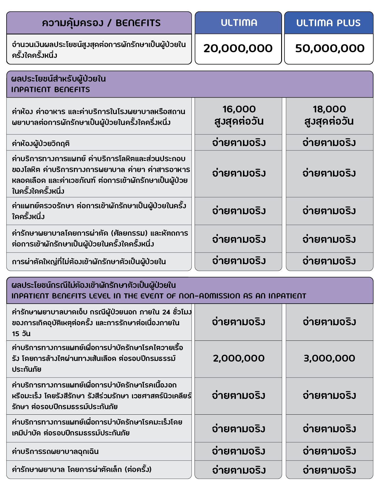 1. การจ่ายตามจริง บริษัทจะจ่ายผลประโยชน์ตามที่จ่ายจริงโดยไม่ต้องเกินผลประโยชน์สูงสุดต่อการพักรักษาเป็นผู้ป่วยในครั้งใดครั้งหนึ่ง